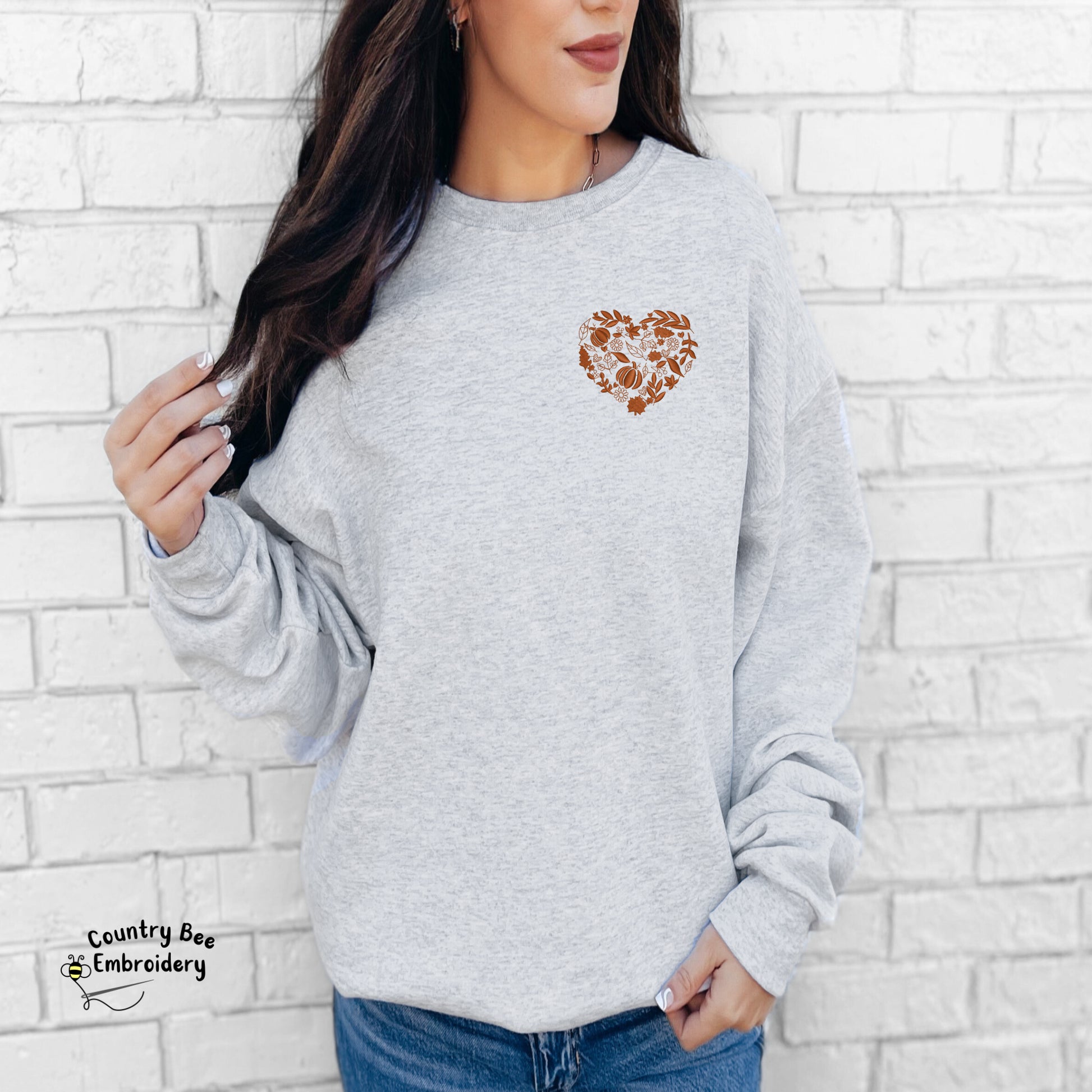 Show your love of fall with this oh so soft, oatmeal heathered crewneck sweatshirt, embroidered with a rustic orange heart filled with leaves, pumpkins, flowers & more hearts. All the basics!