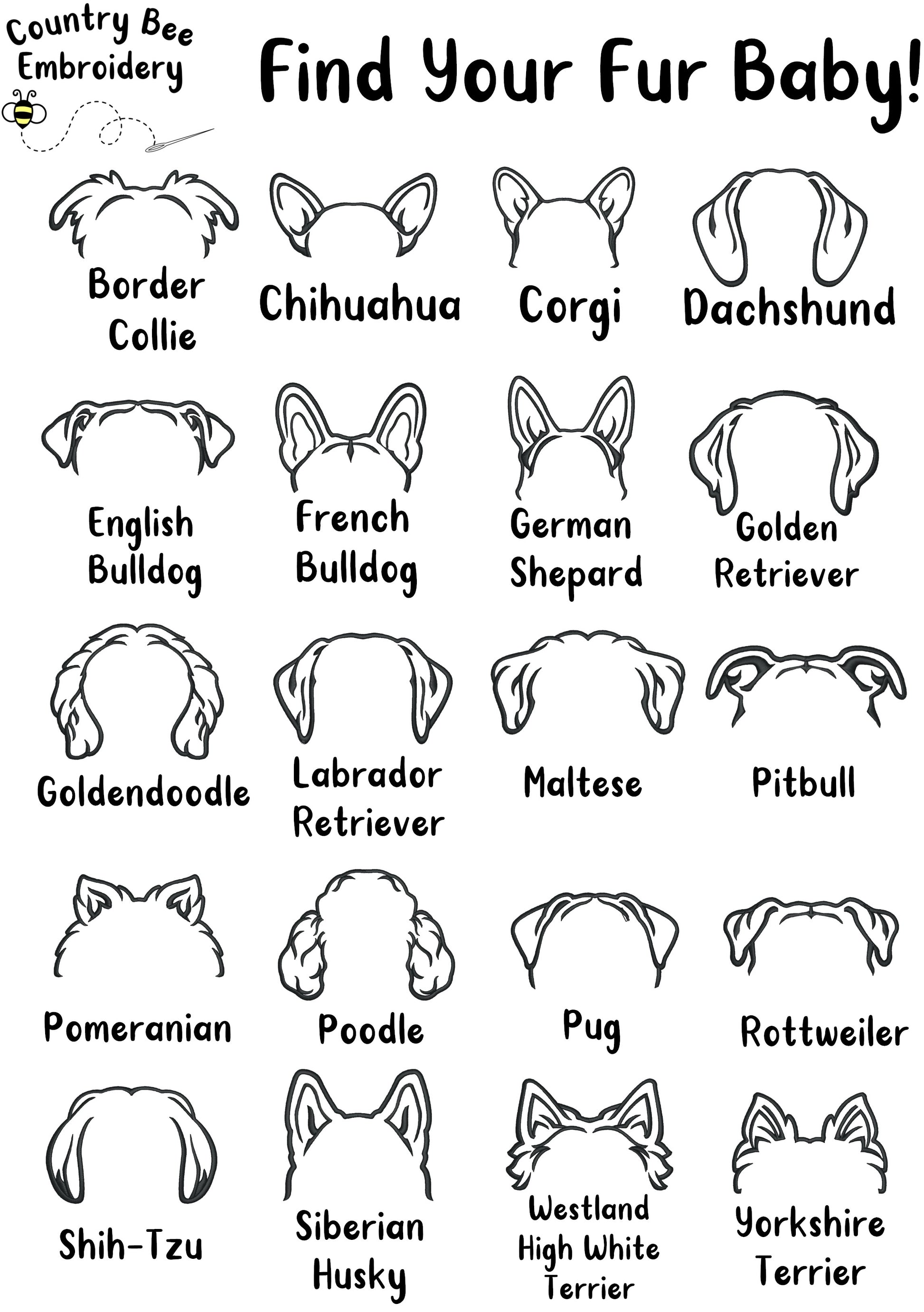 20 Breeds to choose from - Border Collie, Chihuahua, Corgi, Dachshund, English Bulldog, French Bulldog, German Shepard, Golden Retriever, Goldendoodle, Labrador Retriever, Maltese, Pitbull, Pomeranian, Poodle, Pug, Rottweiler, Shih-Tzu, Siberian Husky, West Highland Terrier, Yorkshire Terrier