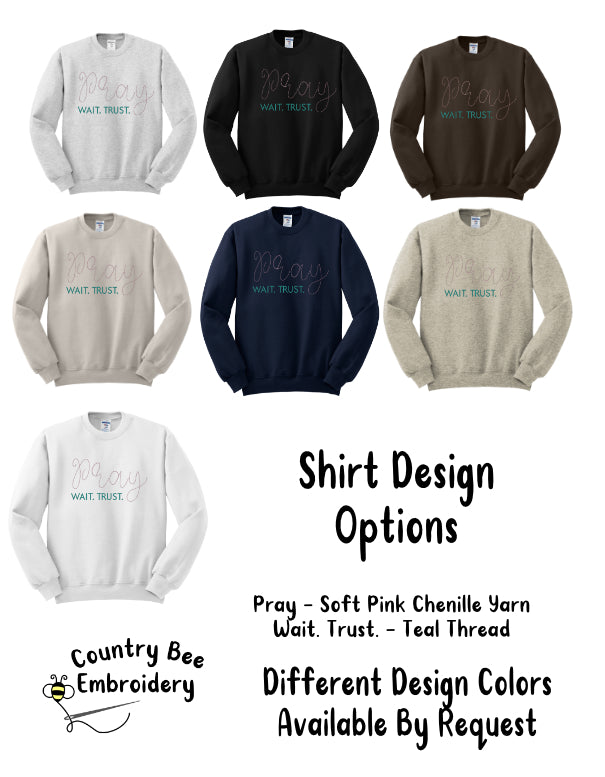 Cozy up in quiet faith with our Pray & Wait Crewneck—a whisper-soft reminder that peace is just one breath away. The word “pray” blooms across your chest in dreamy soft pink chenille yarn, so plush and velvety you’ll reach to touch it every time. Below, “wait. trust.” is stitched in calm teal traditional thread, crisp and steady—like the promise you’re holding onto.