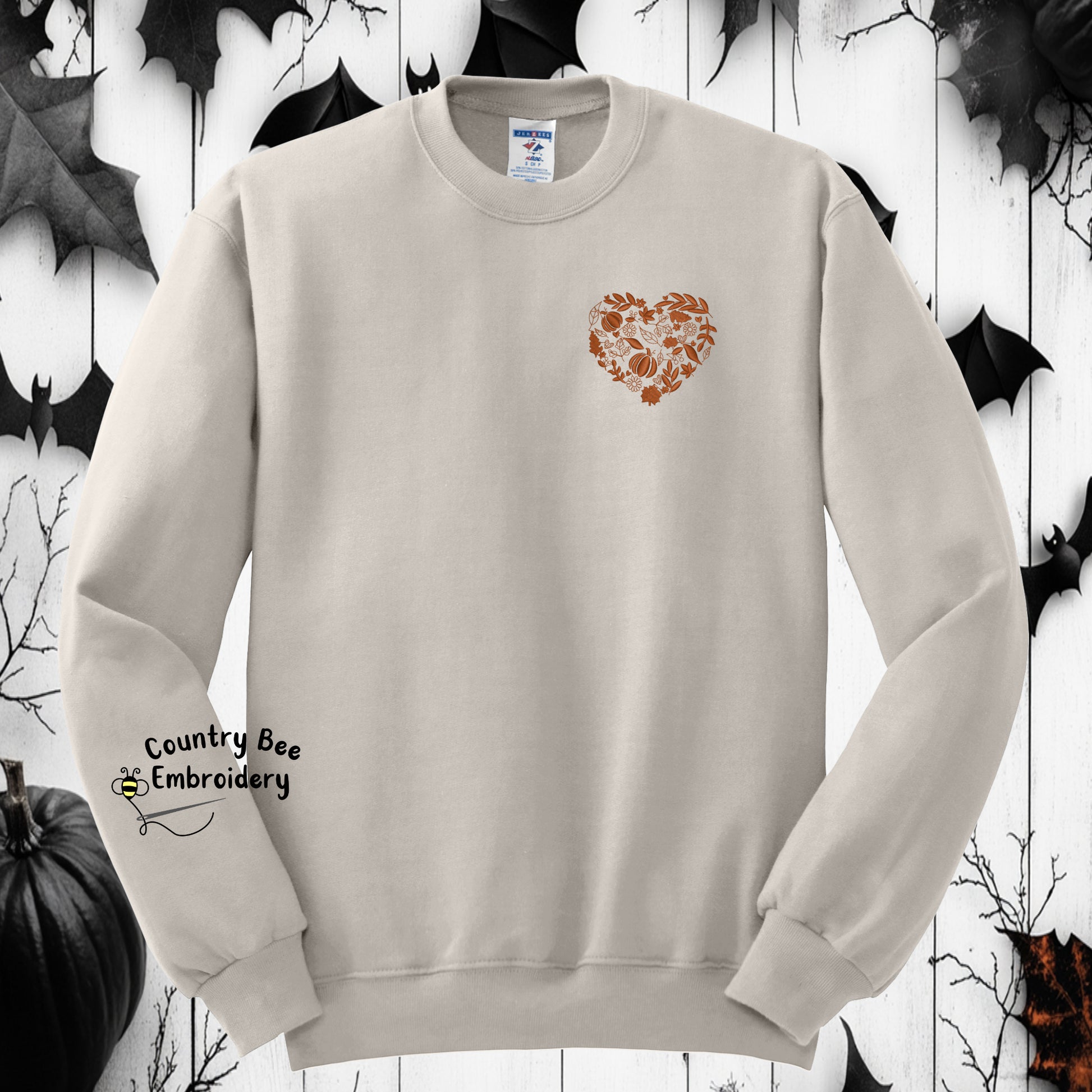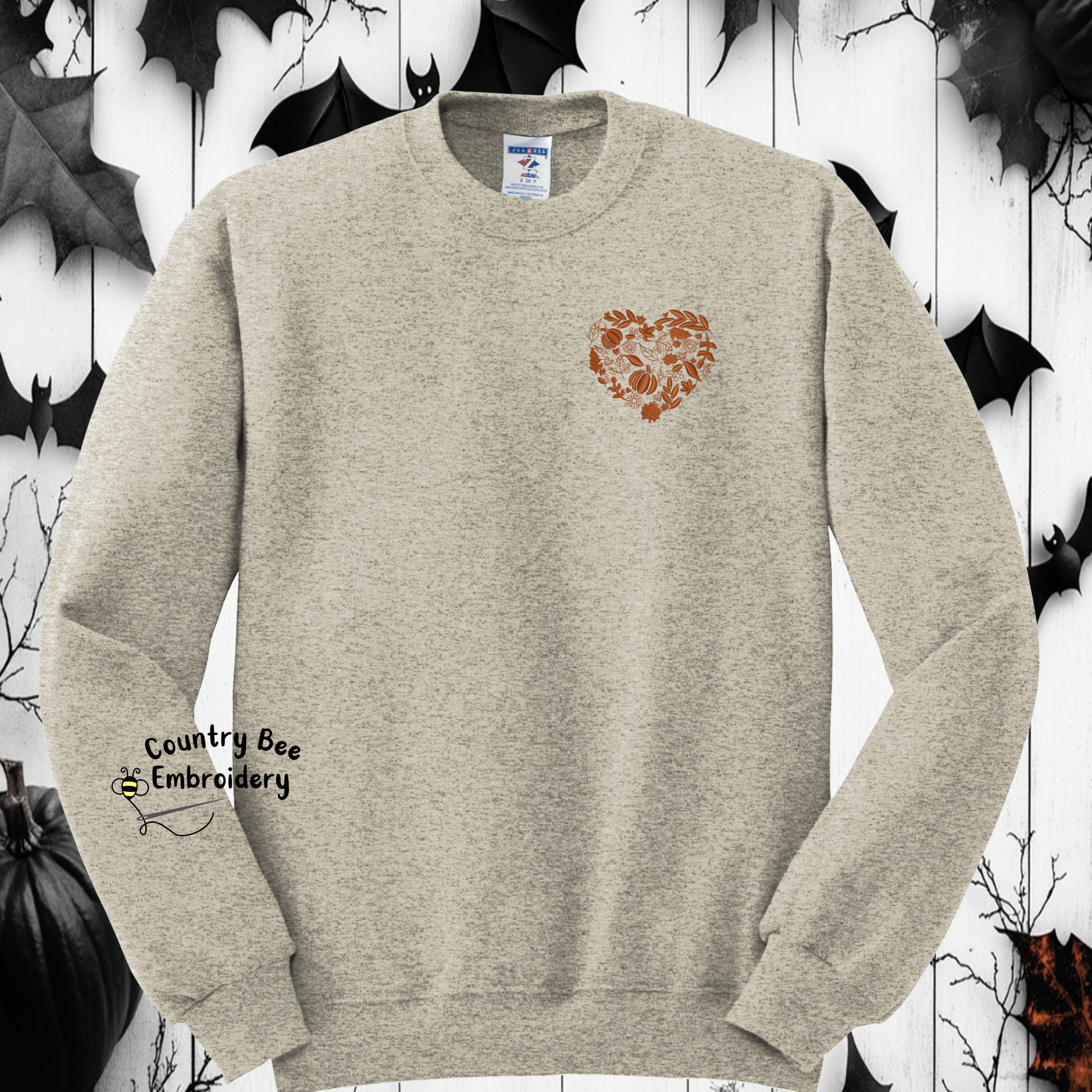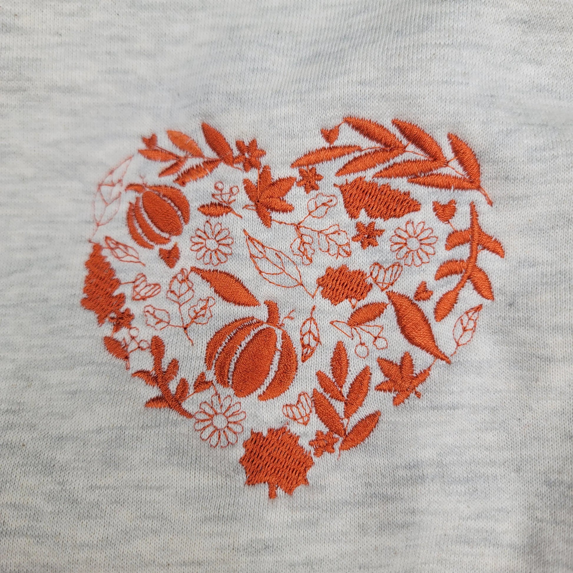 Show your love of fall with this oh so soft, oatmeal heathered crewneck sweatshirt, embroidered with a rustic orange heart filled with leaves, pumpkins, flowers & more hearts. All the basics!