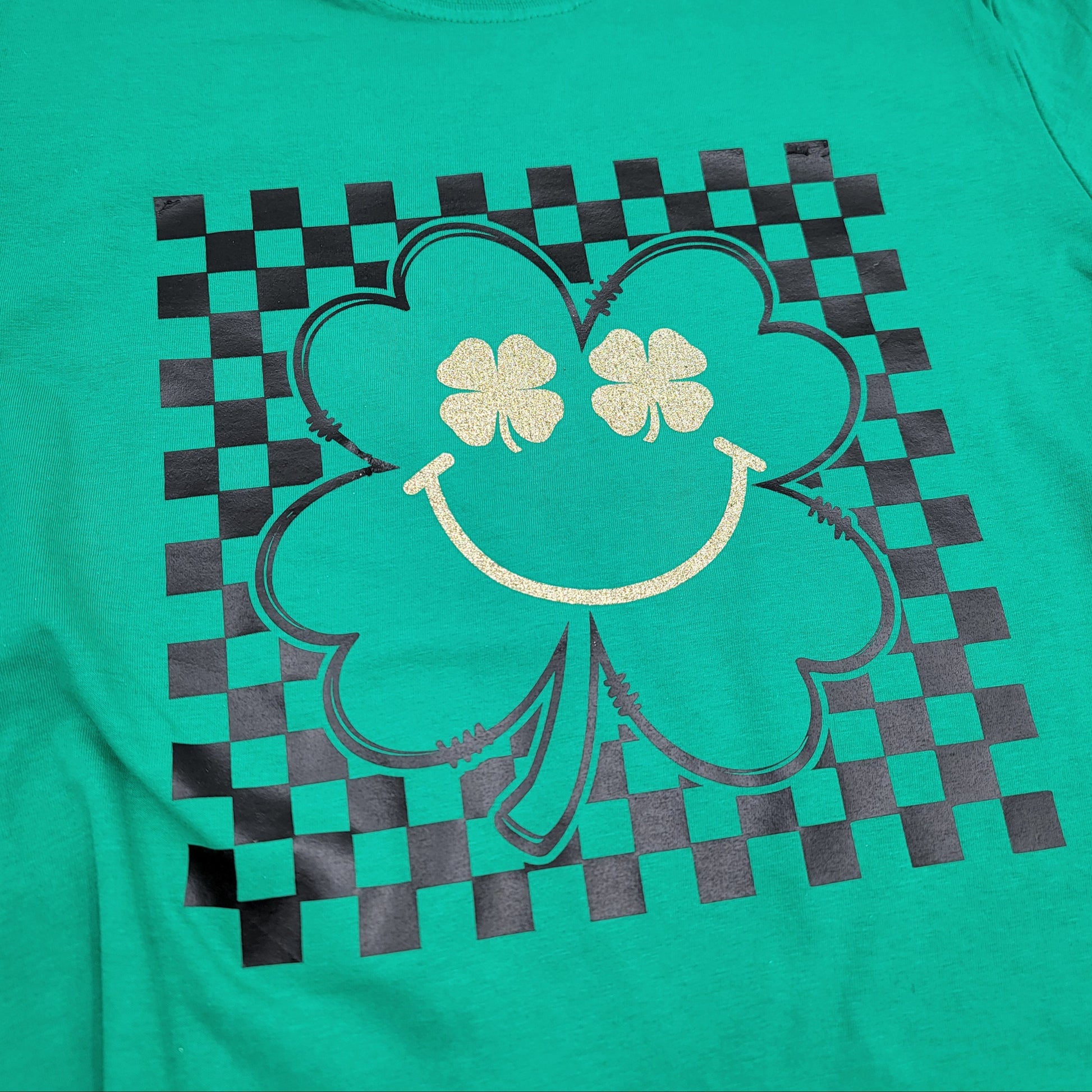 Get lucky in style with this trendy and festive St. Patrick’s Day t-shirt! Featuring a golden glitter smiley face with a checkered clover design, this tee is the perfect blend of fun, fashion, and Irish spirit. Whether you're celebrating at a parade, hitting the pubs, or just showing off your love for all things green, this shirt is sure to bring smiles and good vibes.