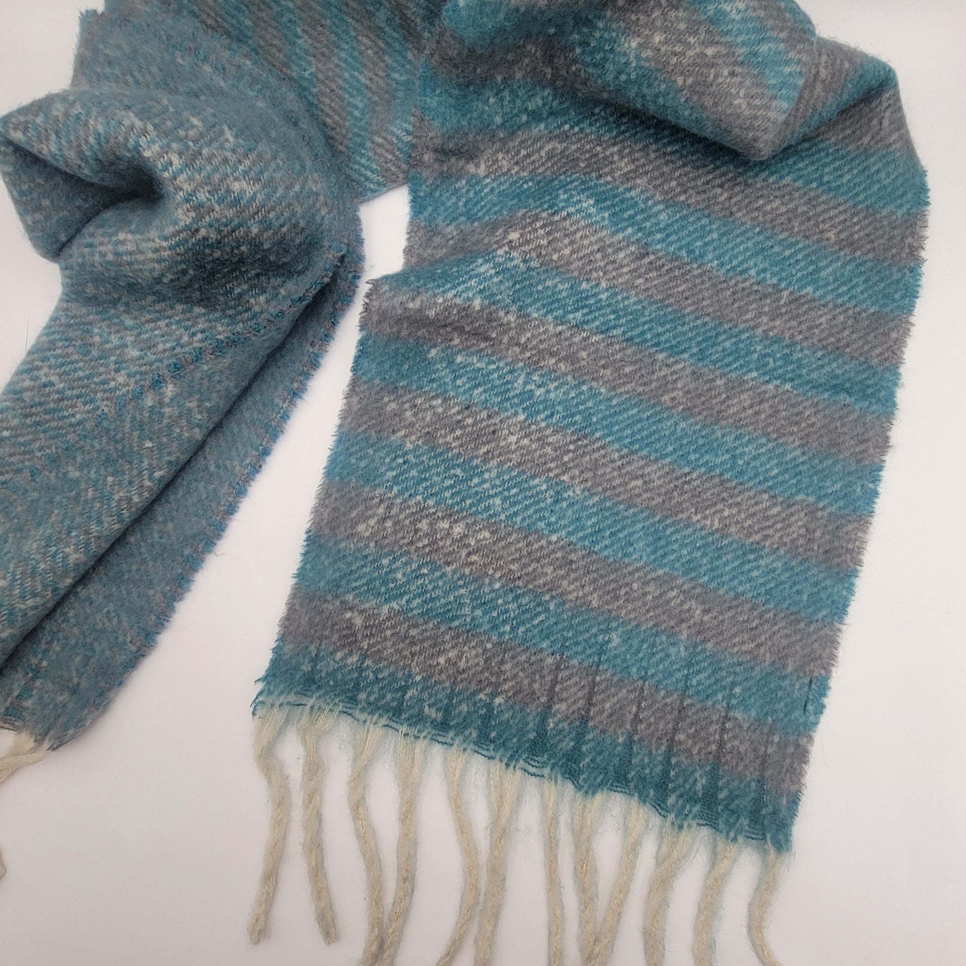 This super soft blue and gray striped scarf is as cozy as it is cute! Made from a plush polyester that feels like a cloud, warm, lightweight & perfect for winter everyday wear. Whether your dressing up a winter coat or adding a touch of cozy charm to your everyday wear, this scarf is the perfect finishing touch.